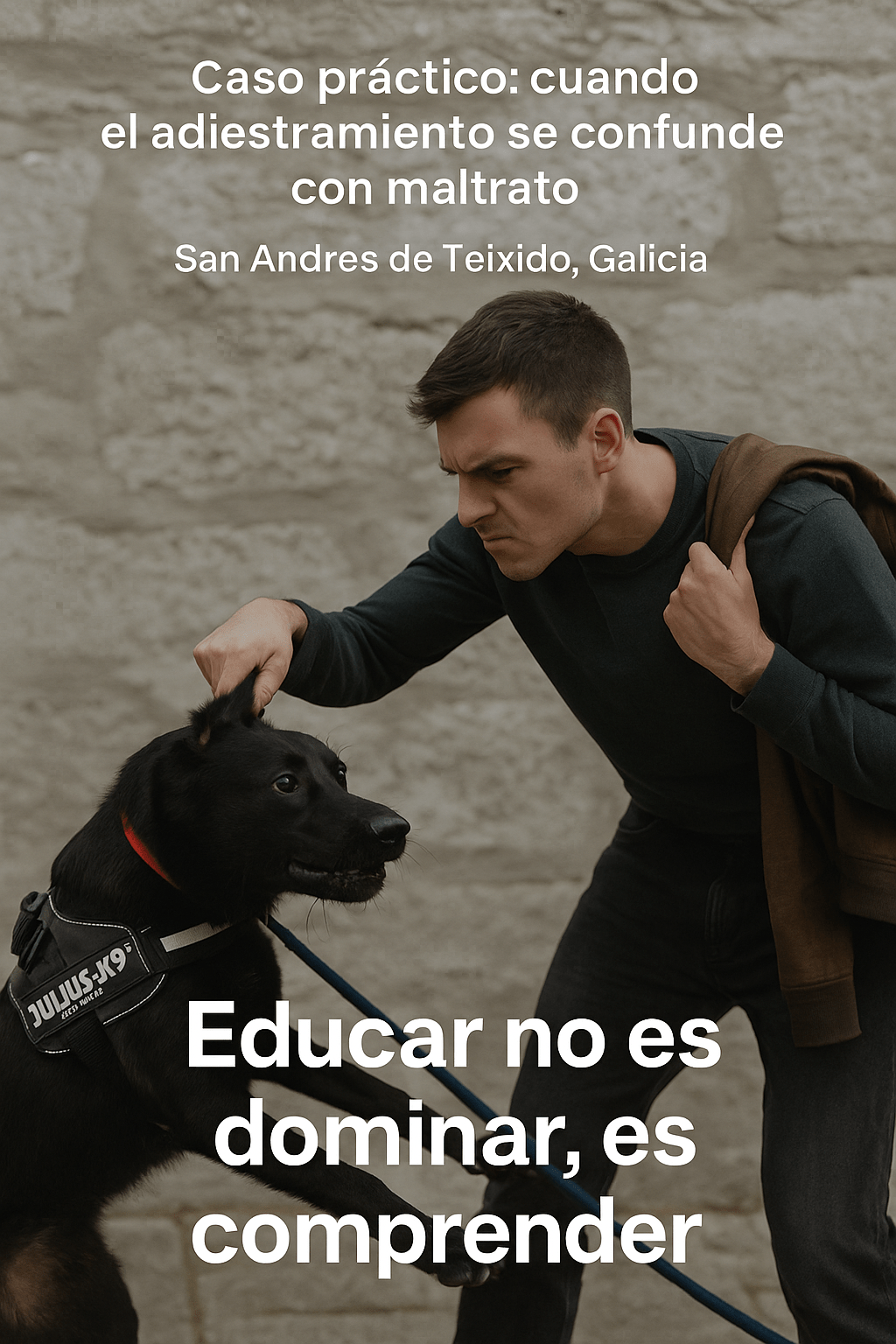 El otro día, el sábado pasado, en Santo André de Teixido, presencié una escena que aún me cuesta olvidar. Un chico joven caminaba con un perro negro, fuerte, de mezcla cercana al pastor belga. Llevaba un arnés Julius K9 y una correa corta, de menos de dos metros. El perro tiraba con energía, curioso y lleno de vida, mientras su tutor, visiblemente molesto, trataba de controlarlo con brusquedad.