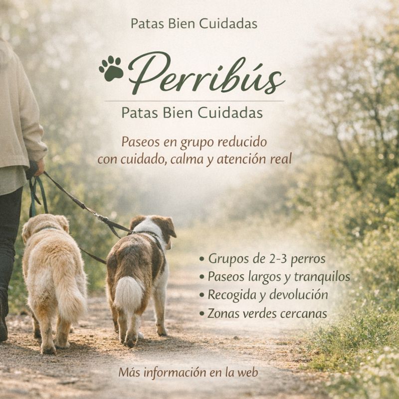 El Perribús Patas Bien Cuidadas nace como un servicio de paseos en grupo reducido, pensado para perros sociables que necesitan moverse, relacionarse y disfrutar del entorno de una forma tranquila y respetuosa, lejos de prisas y de grupos masificados.